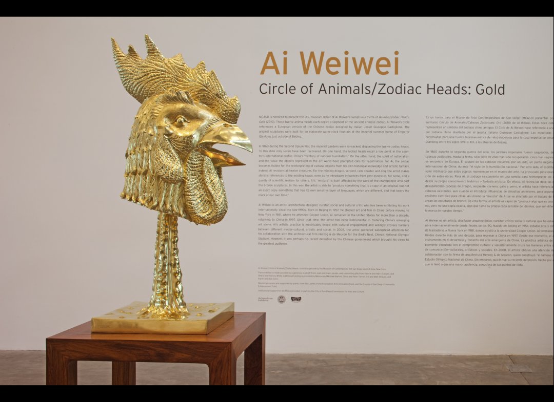 When a group of visitors from the Museum of Contemporary Art, San Diego, visited the Beijing studio of the artist Ai Weiwei in November of 2010, they came across a work in progress; a dozen gilded sculptures of animal heads. "They were on the ground, not even on blankets," recalls curator Kathryn Kanjo. "There they were; so ornate, decadent and garish."